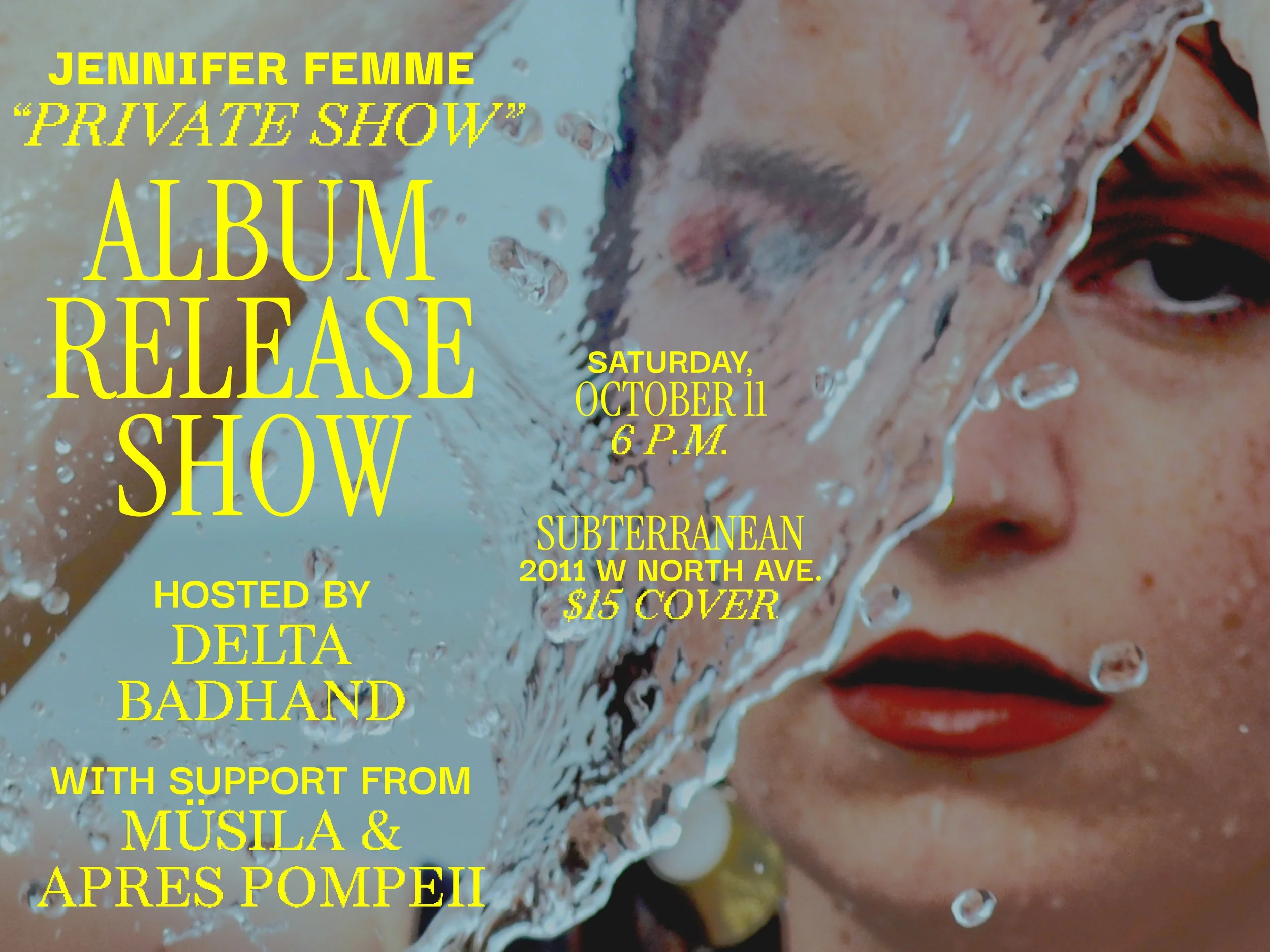 Jennifer Femme is a fusion band from Chicago, known for genre fluidity and impressive, though non-pretentious, musicality. Their debut album Private Show “proves that jazz can be contemporary, that vocals can be an instrument in the hands of a professional, that eclecticism can work if you know what you’re doing.” (Indie Boulevard). The band consists of lead vocalist/songwriter/guitarist Alexis Kellogg, saxophonist Aja Essex, guitarist Quinn Miller, drummer Anna Poeht, cellist Todd Aulwurm, and bassist Aster Reyes. Following a sold out album release show in October 2025, Jennifer Femme is preparing for a midwest tour this Spring and a mainstage feature at Chicago’s Midsommarfest this Summer.